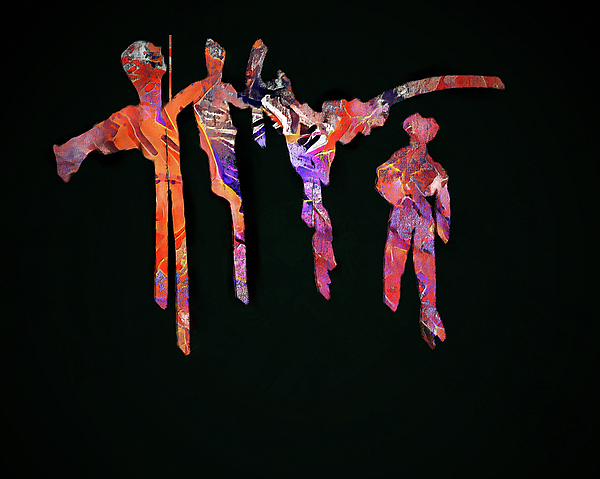Hop Skip Jump is a contemporary figurative painting by marina flournoy. it depicts four abstract figures in neutral shades of beige and brown against a black background. The figures have a texture much like fabric. This is a fanciful work with a sense of fun. It's available in a wide range of sizes from 8 x 6.5 to a very large 48 x 38.